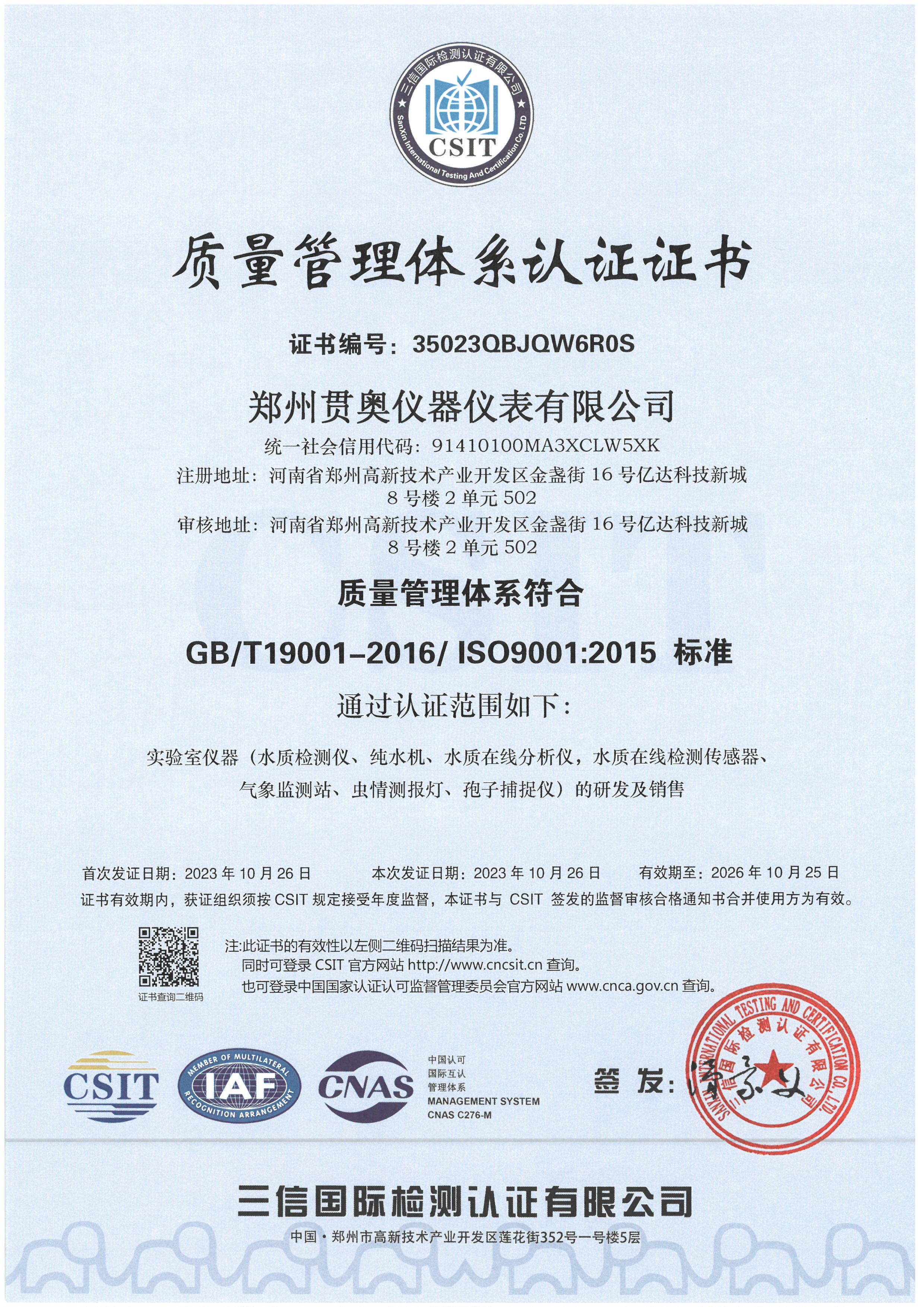 貫奧儀器位于鄭州高新技術(shù)產(chǎn)業(yè)開發(fā)區(qū),是高新技術(shù)企業(yè)、行業(yè)AAA級(jí)信用企業(yè),已通過(guò)GB/T19001:2016質(zhì)量管理體系認(rèn)證、GB/T24001:2016環(huán)境管理體系認(rèn)證和GB/T45001:2020職業(yè)健康安全管理體系認(rèn)證,擁有多項(xiàng)證書,產(chǎn)品已通過(guò)河南省電子信息產(chǎn)品質(zhì)量監(jiān)督檢驗(yàn)院檢測(cè),并出具了相關(guān)檢驗(yàn)報(bào)告,我們以雄厚的研發(fā)實(shí)力、過(guò)硬的產(chǎn)品質(zhì)量、完善的售后服務(wù)為客戶提供分析檢測(cè)技術(shù)解決方案,擁有過(guò)硬的分析儀器生產(chǎn)技術(shù)和整體的水質(zhì)監(jiān)測(cè)解決方案。